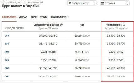 Нагадаємо, ціну на долар в Україні зафіксував Нацбанк на рівні трохи більше ніж 29 грн за USD. На чорному ринку він на 3 травня коштує 33,3/33,5 грн.