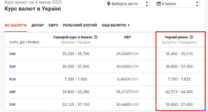 Станом на 4 липня офіційний курс долара становить 29.25 грн за USD, а на чорному ринку 35,4/35,51 грн. Ціна у понеділок майже не змінилася з вихідних, коли за американську валюту просили на 2 копійки більше за продаж.