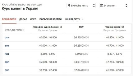 Тим часом, у середу, 24 серпня, курс долара на чорному ринку утримується у вилці 40,85 / 41,00 грн. Для євро цей показник наразі трошки нижчий – 40,70 / 41,00 грн.