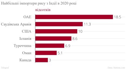 Загалом, найбільшими імпортерами рису з Індії були доволі багаті країни: Об'єднані Арабські Емірати, Саудівська Аравія, США та інші.