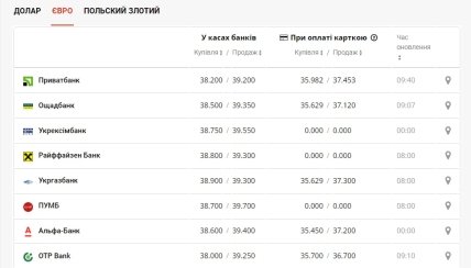 Курс євро встановлений на рівні 35,62 грн за євро. На чорному ринку його можна придбати за 39,30 грн, продати — за 39,60 грн.