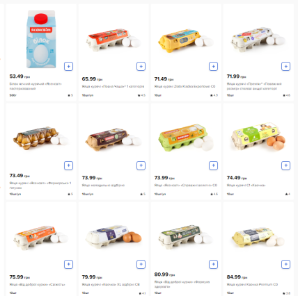 У супермаркеті "Сільпо", згідно з інформацією на офіційному сайті, вартість десятка яєць починається від 65,99 грн. Найвища ціна — 84,99 грн/10 шт.