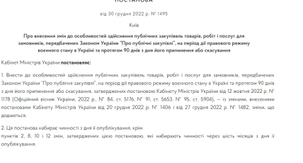 Відповідно до постанови КМУ від 30 грудня, такий захід — на час дії правового режиму воєнного стану в Україні протягом 90 днів після його закінчення чи скасування. Відповідно до переліку змін, що додаються, строк розгляду найбільш вигідної позиції не повинен перевищувати 5 робочих днів. Замовник може її відхилити. Якщо ціна виявиться аномально низькою, учасник має надати пояснення.