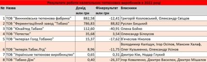 На підставі різниці між кількістю придбаної сировини для виробництва та виплачених акцизів експертами парламентської комісії було виявлено низку компаній, які можуть бути виробниками контрафакту через велику відмінність у цих показниках.