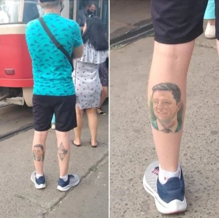 У Києві на трамвайній зупинці помітили чоловіка з татуюванням із зображенням Володимира Зеленського. Президент України на зеленому фоні посміхався людям з ноги його прихильника. Реакція соцмереж не змусила на себе чекати.