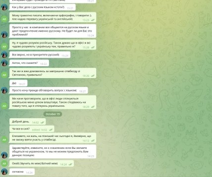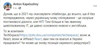 Він опублікував скріншоти листування з рекрутером, яка попередньо домовившись про співбесіду, потім скасувала його з формулюванням "якщо ви бажаєте спілкуватися українською, то ми не можемо запропонувати вам цю позицію".