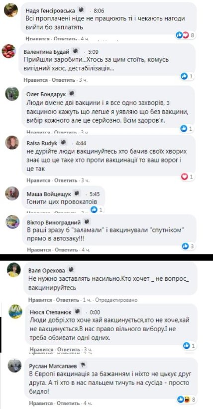 У коментарях до трансляції "Телеграфа" думка людей розділилися, прозвучали думки про те, що мітинг був проплачений, а інші все ж таки закликали сходити вакцинуватися, посилаючись на власний досвід хвороби.