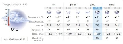 Наразі у Києві фіксується температура нижче нуля (-1°С). Зниження до пізнього вечора не планується, проте збільшується ймовірність опадів – до 81%. Імовірно, на столицю все ж таки опуститься черговий снігопад разом із дощем. Також не виключається налипання мокрого снігу та погіршення видимості до пів кілометра — через опади та туман.