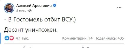 А ще пізніше, близько 22:10, Арестович знову оновив свою інформацію: "Ось тепер точно відбили.) Аеропорт Гостомелю наш. Російський десант знищений".