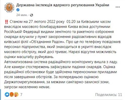 "Станом на 27 лютого 2022 1:20 за Київським часом внаслідок масового бомбардування Києва всіма доступними в Російській Федерації видами зенітного та ракетного озброєння снаряди потрапили до пункту захоронення радіоактивних відходів київської філії "Об’єднання Радон", — сказано в повідомленні.