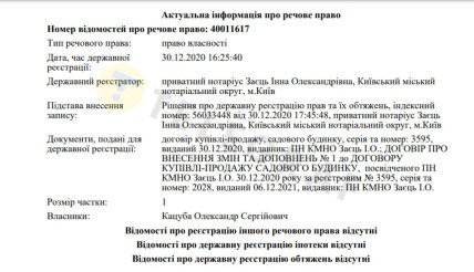 Нині будинок і земельна ділянка належать не Сергію Кацубі, про що свідчать витяги з Держгеокадастру та реєстру речових прав на нерухоме майно. У 2020 році права власності перейшли до Кацуби Олександра Сергійовича. Таким чином власником ймовірно може бути син ексчиновника "Нафтогазу" Олександр.