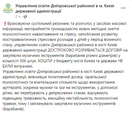"Враховуючи суспільний резонанс та розголос у засобах масової інформації, несприйняття громадськістю нових методик зняття психологічного навантаження та стресу, запобігання розвитку посттравматичних стресових розладів у дітей у період воєнного стану, управлінням освіти Дніпровської районної в місті Києві державної адміністрації достроково розривається договір на закупівлю музичних інструментів (барабанів різних діаметрів) у кількості 306 штук", – йдеться у повідомленні.