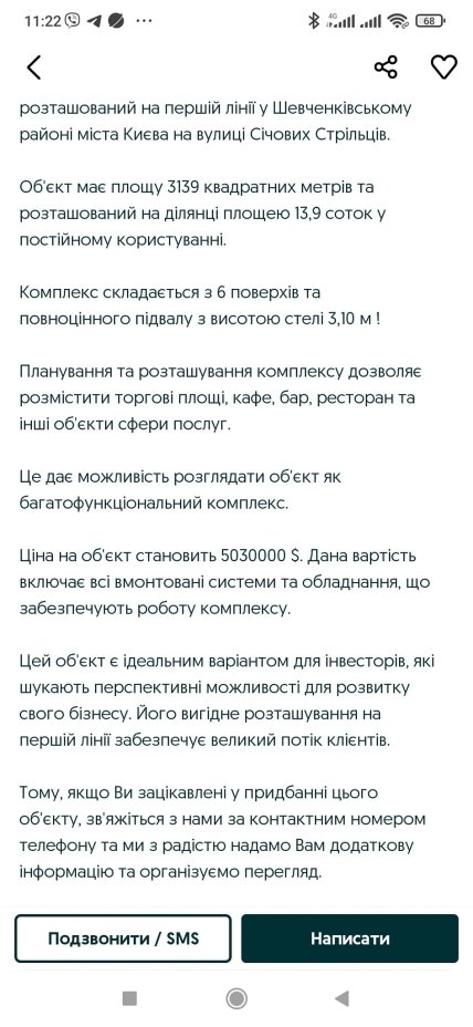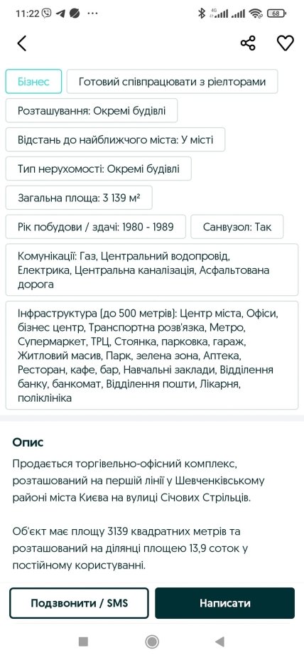 В оголошенні про продаж вказується, що торговельно-офісний комплекс розташований на першій лінії забудови. Об'єкт має площу 3139 квадратних метрів і міститься на ділянці площею 13,9 соток і перебуває у постійному користуванні.