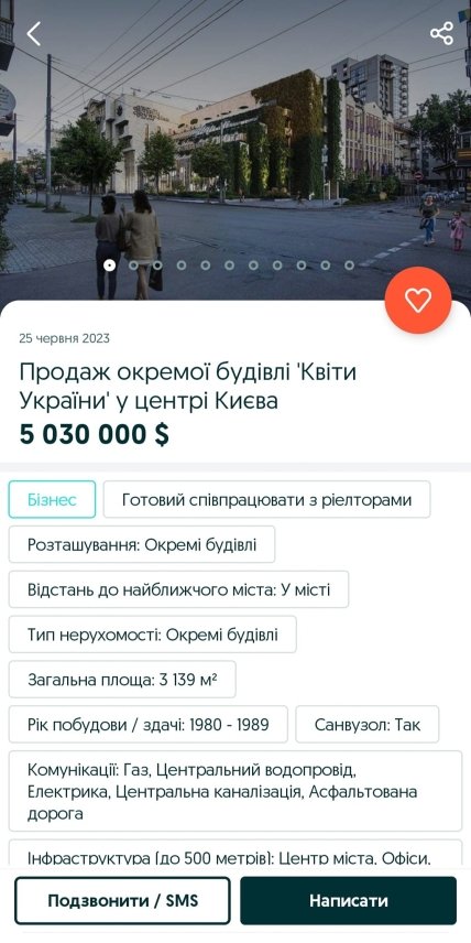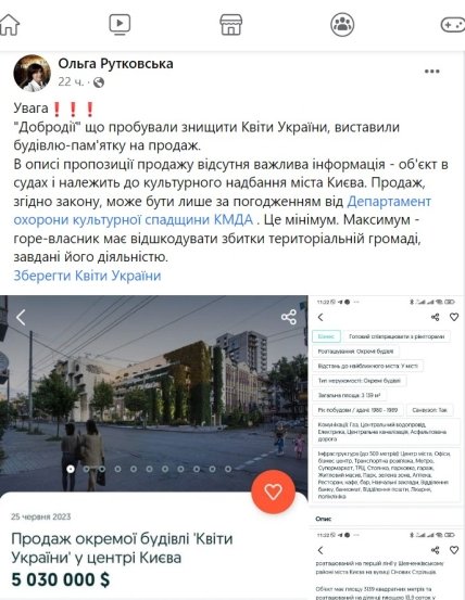 "Добродії", що пробували знищити "Квіти України", виставили будівлю-пам'ятку на продаж. В описі пропозиції продажу відсутня важлива інформація — об'єкт в судах і належить до культурного надбання міста Києва. Продаж, згідно закону, може бути лише за погодженням від Департамент охорони культурної спадщини КМДА. Це мінімум. Максимум — горе-власник має відшкодувати збитки територіальній громаді, завдані його діяльністю", — написала активістка на своїй Facebook-сторінці.