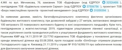 Цікаво, що у Голосіївському райсуді Києва лежить справа про зловживання службовим становищем деяких чиновників ДАСІ, КМДА, інших органів влади та ухилення від податків низки забудовників.