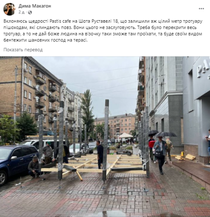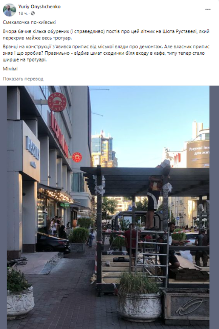 Так, днями в мережі почали з’являтися пости із фотографіями літнього майданчика одного із закладів на вулиці Шота Руставелі. Кияни поскаржилися на таке рішення та наголосили, що пішоходам залишили буквально шматочок тротуару.