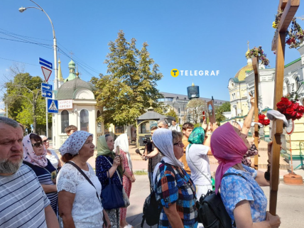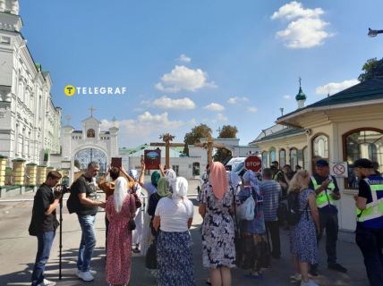 Крім того, біля центрального входу до Лаври зібралося близько 20 осіб, переважно жінки середнього віку. Люди тримають дерев'яні хрести й ікони та моляться.