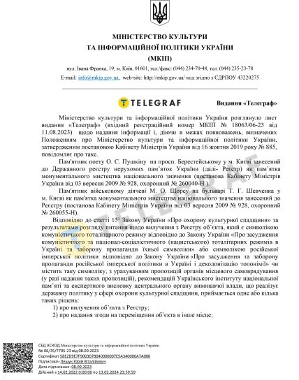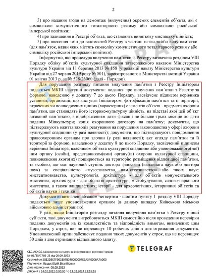 "Вилучення пам’ятки з Реєстру провадяться відповідно до категорії пам'ятки: зокрема пам'ятки національного значення — постановою Кабінету міністрів України за поданням центрального органу виконавчої влади, що забезпечує формування державної політики у сфері охорони культурної спадщини. Інформуємо, що на момент підготовки зазначеного листа, подання від виконавчого органу Київської міської ради (Київської міської військової адміністрації) про перенесення чи вилучення з Державного реєстру нерухомих пам'яток України зазначених пам'яток до МКІП не надходило", — повідомили в Мінкульті.