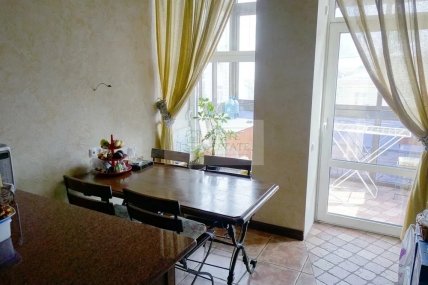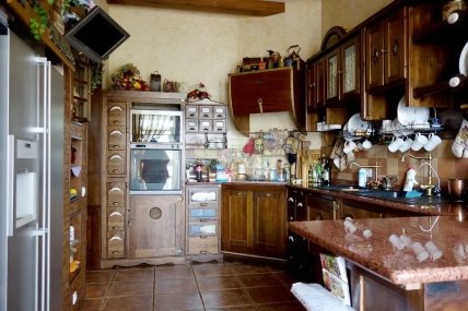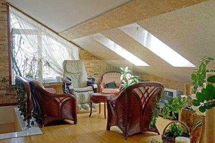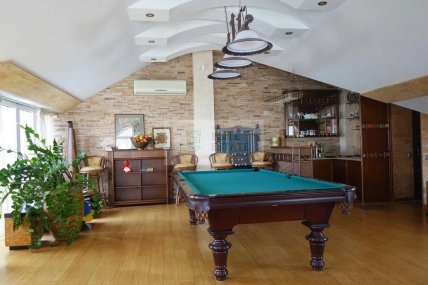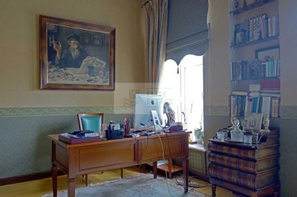 Згідно з описом, ремонт у пентхаусі авторський та дорогий, виконаний з натуральних матеріалів. Дійсно, робочий кабінет зроблений під старовину, основний стіл виконаний з дерева, як і шафка у вигляді стосу книг. Вікна оздоблені шторами під старовину, а на стіні висить картина у дерев’яній рамці. Єдине, що видає оснащення квартири за останнім словом техніки – це комп’ютер від Apple на робочому столі, який вибивається із загального дизайну кімнати.
