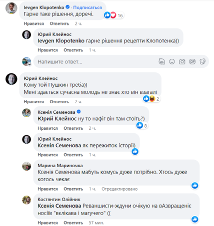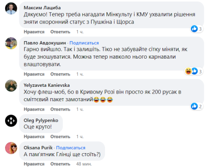 "Якось хайп по дерусифікації спав, а Пушкін так і стоїть. Наче так і треба, ніхто не помічає. Ми повісили демаскувальну сітку на пам'ятник пушкіну для того, щоб нагадати суспільству та владі, що символи російського імперіалізму досі спокійно стоять у наших містах і процес дерусифікації має відбуватися активніше", — зауважила Ксенія Семенова.