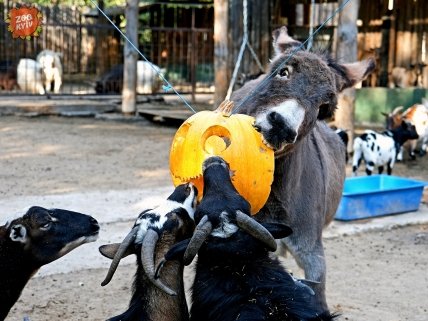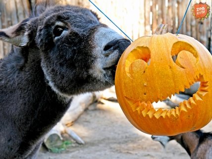 У київському зоопарку вирішили також влаштувати своєрідне святкування Геллоуіна та почастували тигрів, лемурів, віслюків та інших тварин гарбузовими "головами" з різними гримасами.