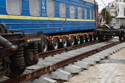 Для встановлення вагона на бруківку робітники спершу змонтували на площі рельсошпальну решітку. Потім за допомогою підйомного крана його було перевантажено з тягача на вагонні візки. Як можна побачити, на корпусі вагона видно численні отвори від уламків снаряда, що вилучив неподалік.