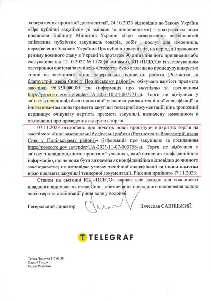 — 7 листопада оголошено про початок нової процедури відкритих торгів на закупівлю "Інші завершальні будівельні роботи (Розчищення та благоустрій озера Синє у Подільському р-ні". Торги не відбулись у зв'язку з невідповідністю пропозиції учасника, який визначив конфіденційною інформацію, що не може бути визначена такою, відповідно до чинного законодавства; не відповідає умовам технічної специфікації та іншим вимогам щодо предмета закупівлі тендерної документації. Рішення прийняли 17 листопада. Станом на сьогодні КП "Плесо" вживає всіх заходів для можливості швидшого відновлення озера Синє, забезпечення природного наповнення водою чаші озера та стабілізації рівня води у водоймі, — зазначив він.