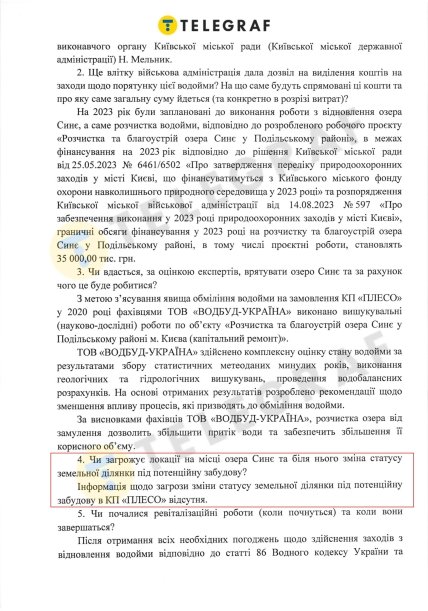 Втім, у "Плесі" інформацію про зміну статусу земельної ділянки на місці водойми та поблизу не підтверджують.