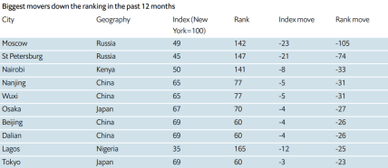 Крім цього, найбільшими "лузерами" у рейтингу виявилися москва та санкт-петербург — ці міста впали відразу 23 та 21 позицію відповідно. Дослідники пояснюють цю тенденцію падінням рубля через запровадження санкцій.