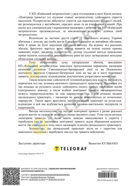 — На відміну від реальних збитків, фактичну вартість яких можна виявити на основі оцінки прямих майнових втрат, завданих підприємству, розмір упущеної вигоди неможливо прямо оцінити, оскільки на законодавчому рівні не існує затвердженої методики обчислення упущеної вигоди. Тому обґрунтовану суму матеріальних збитків, заподіяних КП "Київський метрополітен" внаслідок призупинення перевезень пасажирів наземною ділянкою Святошинсько-Броварської лінії та на Південному мостовому переході Сирецько-Печерської лінії на час дії в місті повітряної тривоги, підтверджену відповідними документами, розрахувати неможливо, — каже заступник директора Дептрансу Валентин Кульбако.
