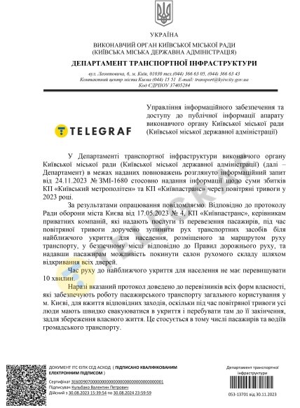 У Києві повітряні тривоги і викликані ними зупинка наземного транспорту та скасування руху поїздів метро на Лівий берег Дніпра завдають збитків комунальним транспортним підприємствам. Втім, точну суму економічної шкоди розрахувати неможливо. Про це на інформаційний запит "Телеграфу" повідомили в департаменті транспортної інфраструктури Київської міської державної адміністрації.