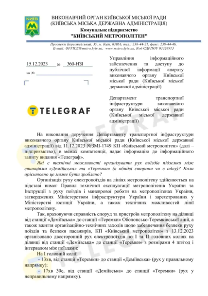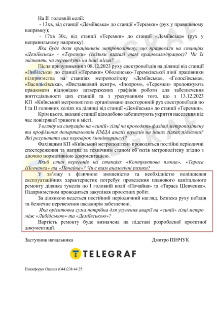 Після цього "Телеграф" звернувся з інформаційним запитом до заступника начальника КП "Київський метрополітен" Дмитра Пінчука і попросив його розповісти про стан станцій метро "Почайна" та "Тараса Шевченка". У метрополітені повідомили редакції про реальну фізичну зношеність тунелів у двох районах столиці, проте про закриття станцій на час ремонту мови вже не йшла.