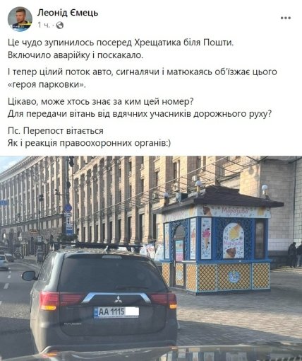 "Це чудо зупинилось посеред Хрещатика біля Пошти. Включило аварійку і поскакало. І тепер цілий потік авто, сигналячи і матюкаючись, об'їжджає цього "героя парковки". Може, хтось знає за ким цей номер? Для передачі вітань від вдячних учасників дорожнього руху? П.С. Перепост вітається, як і реакція правоохоронних органів", — обурився обранець і повідомив, що готує відповідне депутатське звернення в ОДА.
