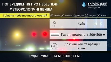 У п’ятницю, 5 січня, у Києві очікується сильний туман, який призведе до обмеженої видимості на дорогах та вулицях міста. Мешканців та гостей столиці попереджають про небезпечні метеорологічні явища — у столиці оголошено І рівень небезпеки (жовтий).