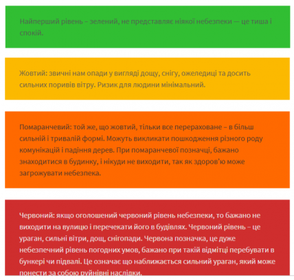 Жовтий рівень – погодні умови потенційно небезпечні. Можливі опади, грози, пориви вітру, високі або низькі температури та ін. Ці явища звичайні для території країни, але часом можуть становити небезпеку.