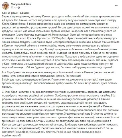 Українська режисерка та сценаристка Марися Нікітюк на своїй сторінці у Facebook опублікувала пост, в якому висловила позицію щодо поведінки організаторів Каннського фестивалю і власне висловлювань російського режисера Кирила Сєрєбрєннікова. Авторка зазначає, що в минулі роки Сєрєбреннікова на заході не було, бо був невиїзним із рф через справу про розкрадання коштів.
