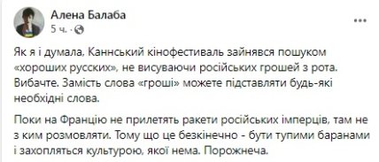 Підтримали обурення режисерки й інші користувачі соцмережі. Так, журналістка та активістка Олена Балаба написала: "Каннський кінофестиваль зайнявся пошуком "хороших русских", не висуваючи російських грошей з рота".