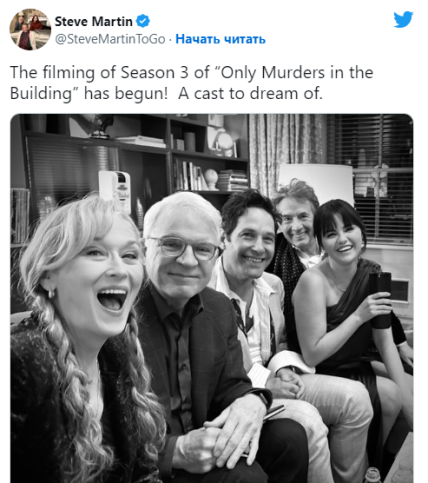 Стрімінговий сервіс Hulu поділився трейлером третього сезону серіалу "Вбивства в одному будинку" – комедійного детективу із славетними коміками вісімдесятих років Стівом Мартіном та Мартіном Шотом у головних ролях. У ролику триразову володарку премії "Оскар" Меріл Стріп показано під час читання сценарію зі своєю роллю. "О, це я!" – вигукує актриса.