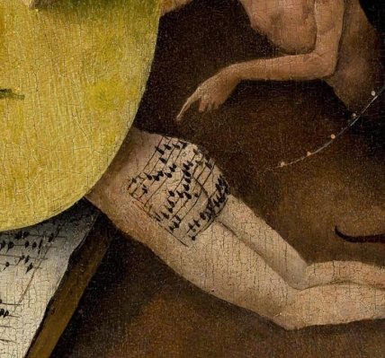 Наймасштабніша і відома робота Босха "Сад земних насолод" таїть в собі величезну кількість загадок. Сенс цієї картини до кінця неясний, але деякі секрети вже вдалося розкрити. На правій стулці триптиха, яка називається "Музичний Пекло", зображені грішники, катували музикою. У одного з них на сідницях зображені середньовічні ноти.