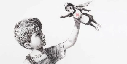 Британський вуличний художник Бенксі опублікував нове графіті - на ньому дитина грає медсестрою в образі супергероя, тоді як персонажі коміксів Людина-павук та Бетмен відправились у смітник.