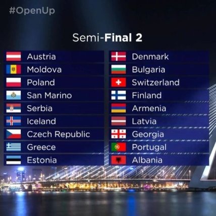 У другому півфіналі конкурсу Євробачення-2020 в Роттердамі виступлять представники таких країн: Австрія, Данія, Молдова, Болгарія, Польща, Швейцарія, Сан-Маріно, Фінляндія, Сербія, Вірменія, Латвія, Ісландія, Чехія, Грузія, Греція, Португалія, Естонія та Албанія.