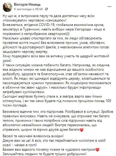 "Виявляється, епідемія COVID-19, глобальна економічна криза, землетрус в Туреччині, навіть вибори мера Ужгорода - ніщо в порівнянні з неприбраною квартирою", - написала вона.