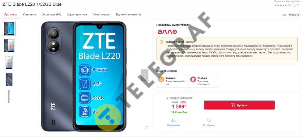 Цей смартфон пропонується як уцінений товар, але з хорошим робочим станом. Він оснащений 6,3-дюймовим екраном з роздільною здатністю 1014×480 пікселів. Працює на чотириядерному процесорі Spreadtrum SC7731E з частотою 1,3 ГГц. Має 1 ГБ оперативної та 32 ГБ вбудованої пам'яті з можливістю розширення за допомогою microSD.