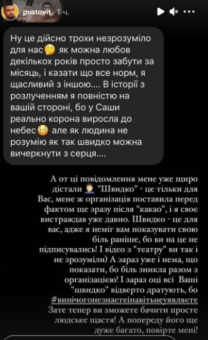 Ще в одній сторіз Пустовіт зазначив, що всі "обвинувачення" щодо того, що він дуже швидко розлюбив свою дружину і знайшов нову — безпідставні, адже ніхто не знає, що він переживав і протягом якого часу.