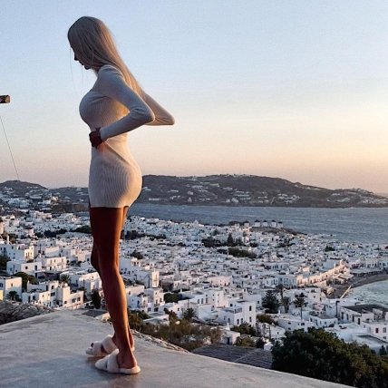 На фото Доні позує в обтислій білій сукні-міні, що відкриває її нескінченно довгі ноги. За деякими даними, зріст моделі становить 180 см. Дівчина також має тонку талію і пишні груди. На другому фото, де відкривається прекрасний вид на грецький острів Міконос, увагу все одно привертають форми Саші.