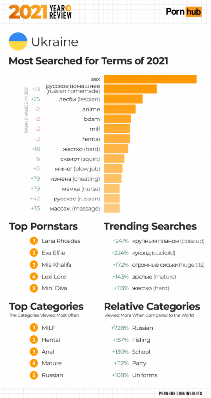 При цьому українці найчастіше обирали категорію MILF (сленговий вираз, що означає привабливих жінок середнього віку, — ред.). Ця категорія також увійшла до трійки лідерів у світі, поступившись лише хентаю (порно-аніме) та японським лесбійським роликам. У світі найпопулярнішою також стала Лана Роудс.