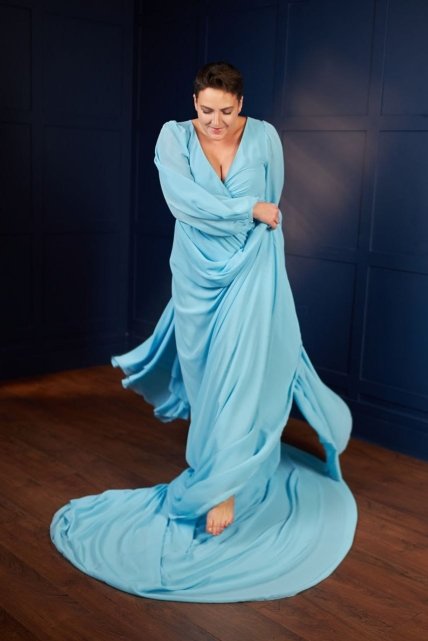 На знімках Савченко постала у двох різних образах — такої собі жінки-вамп у розкішній сірій сукні з відкритими плечима і великим декольте, та ніжною і дуже вразливою дівчиною в довгому блакитному одязі.