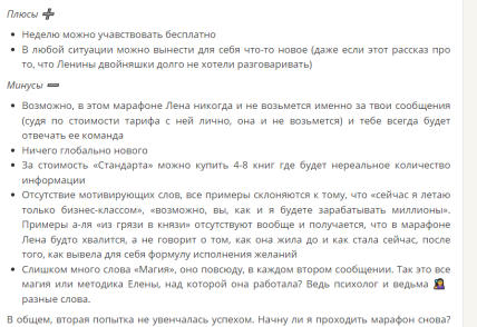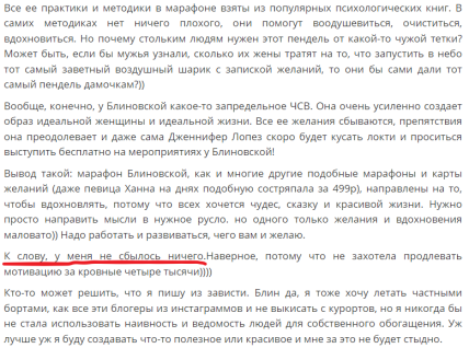 Однак якщо зайти на популярний в інтернеті сайт відгуків irecommend, то можна знайти і менш захоплені відгуки. Так, минулі марафон відзначають, що у завданнях марафону "багато води", а вміст матеріалу абсолютно не відповідає його вартості.