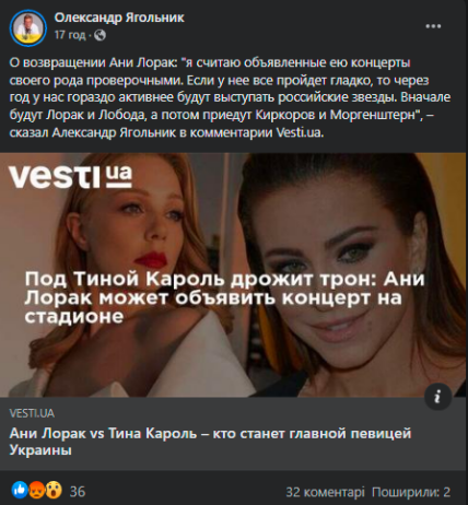 "Якщо у неї все пройде гладко, то через рік у нас набагато активніше виступатимуть російські зірки. Спочатку будуть Лорак та Лобода, а потім приїдуть Кіркоров та Моргенштерн", — розповів Ягольник vesti.ua.