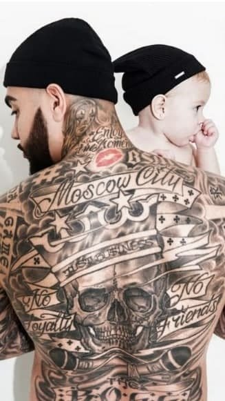 Особливо на репера вказують татуювання на шиї. Там у артиста набитий і його нікнейм "Timati", і купідончик, що стріляє в серце, і улюблене число — 13. Також обличчя дівчини в стилі Чикано, слова "Enjoy the moment" і червоний слід від поцілунку.
